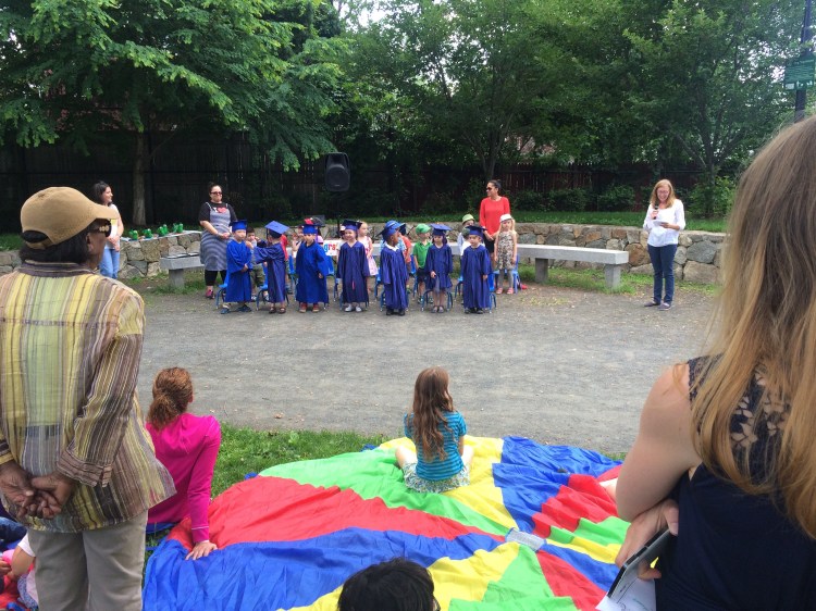 Forleden var der graduation i børnehaven for de af børnene der skal i skole efterferien. De havde hatte og kapper på (kun de børn der har været der fuldtid og betalt fuld pris!). Der var taler og sange og en mor der grådkvalt talte til børnene. Så fik vi også oplevet det!